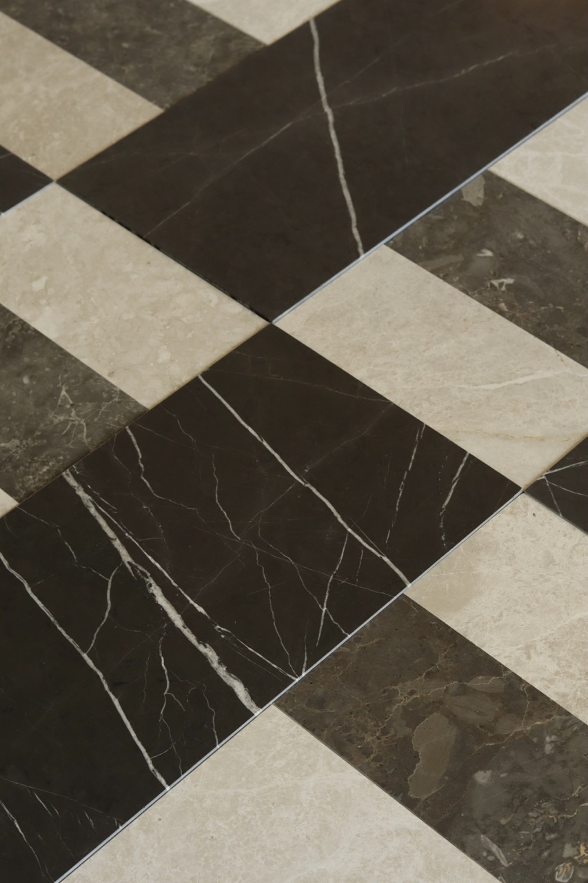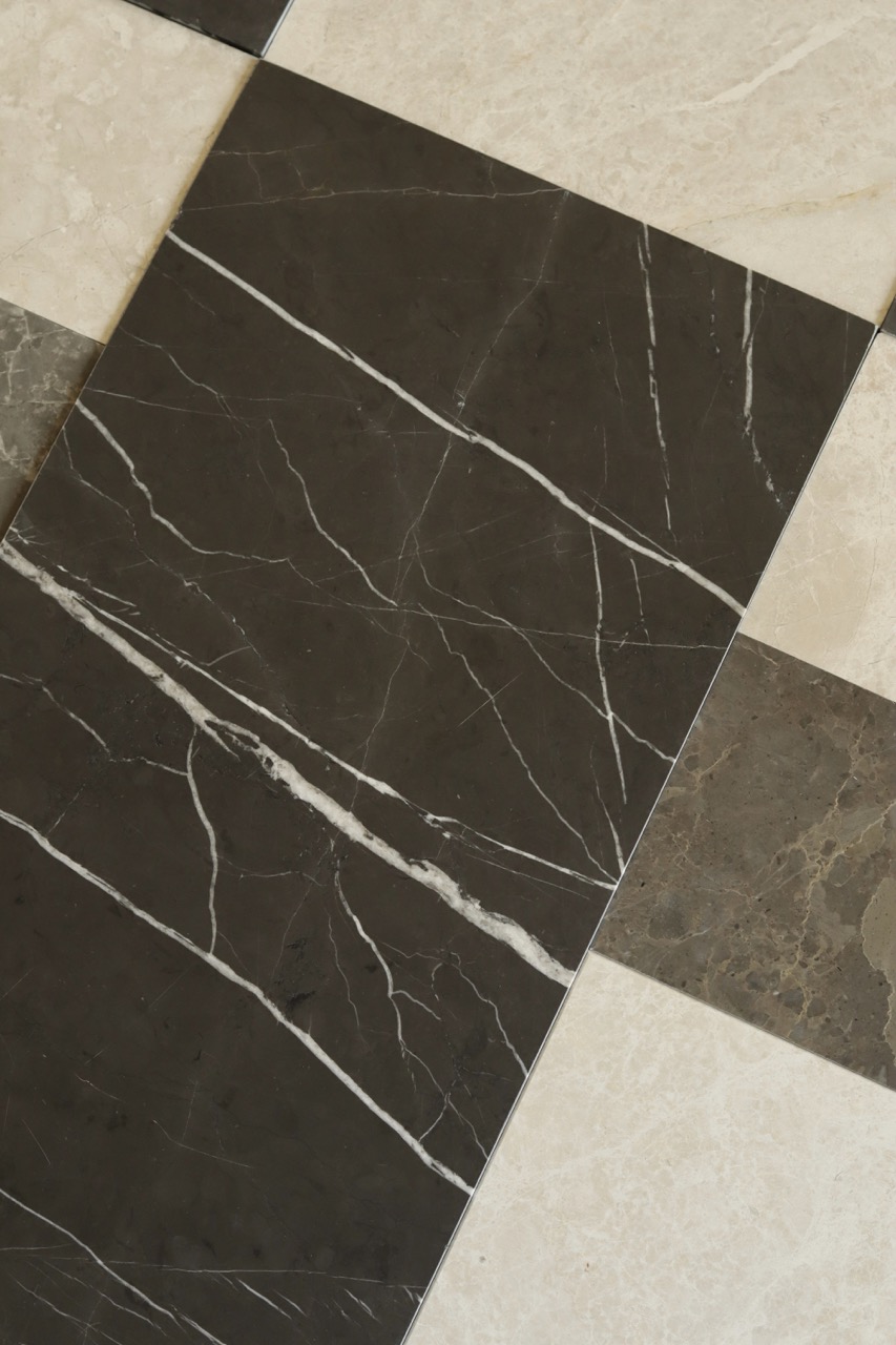 – jasnymi i ciemnymi marmurami, odcieniami beżu, czerni i grafitu,